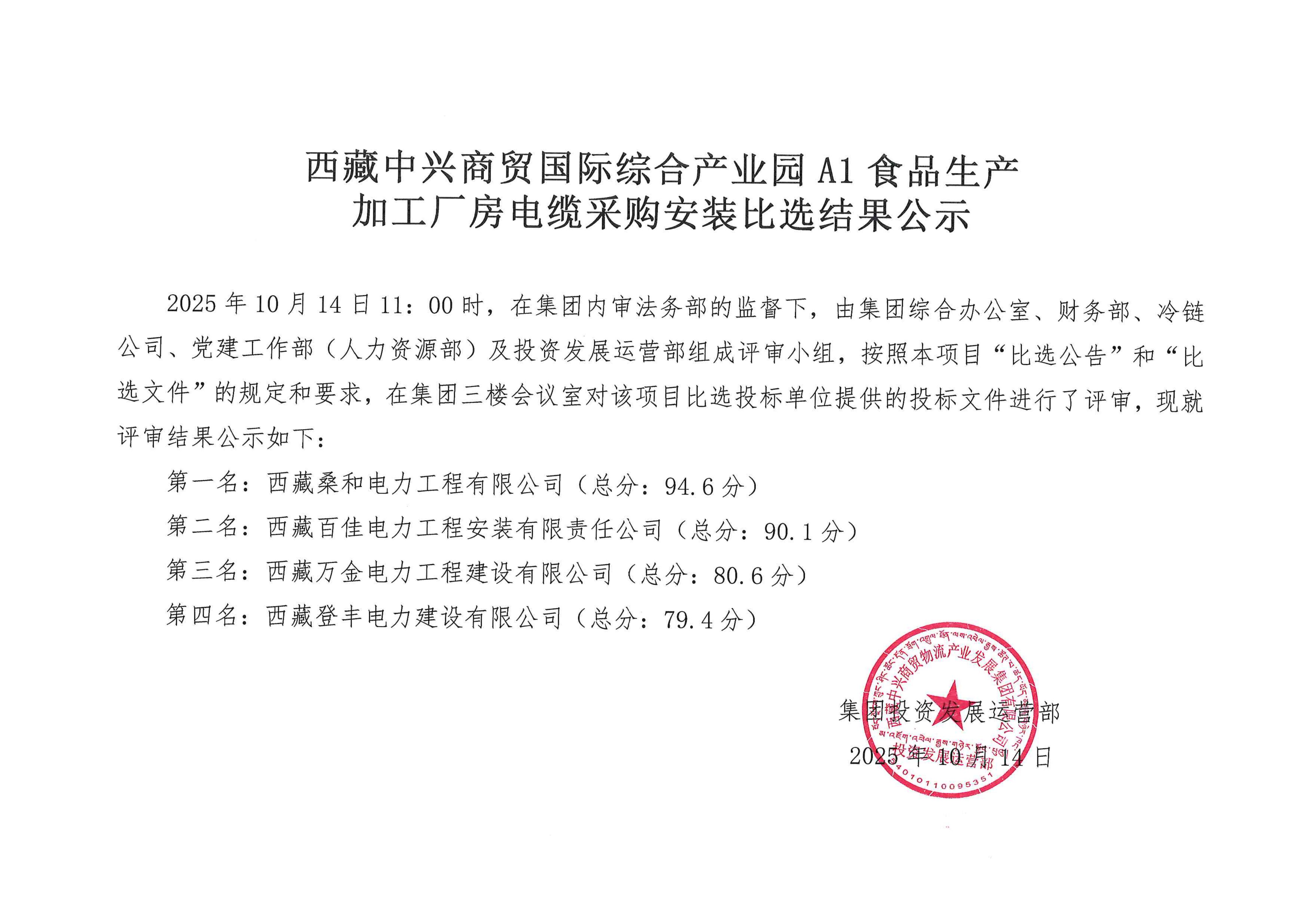 西藏中兴商贸国际综合产业园A1食品生产加工厂房电缆采购安装比选结果公示