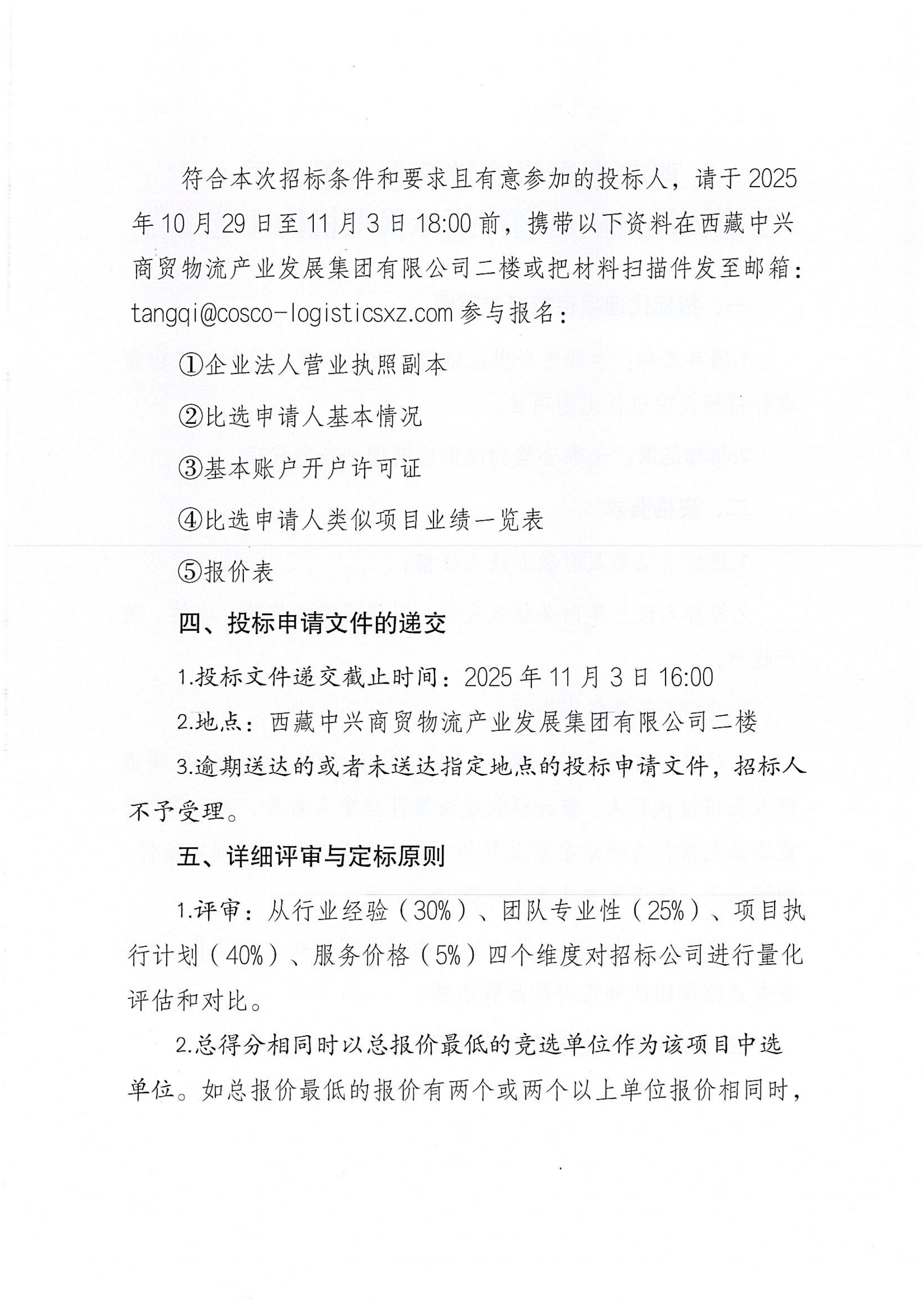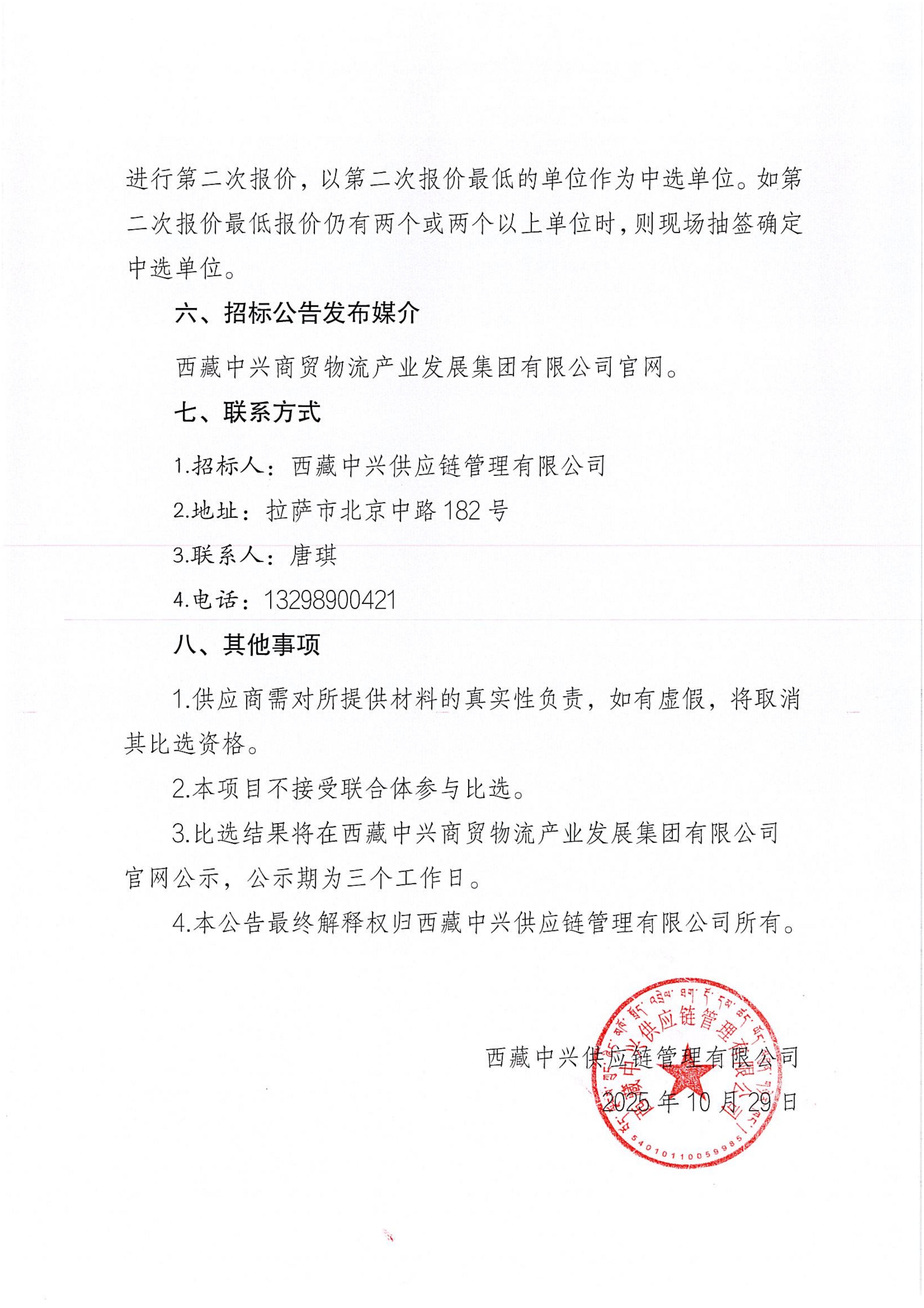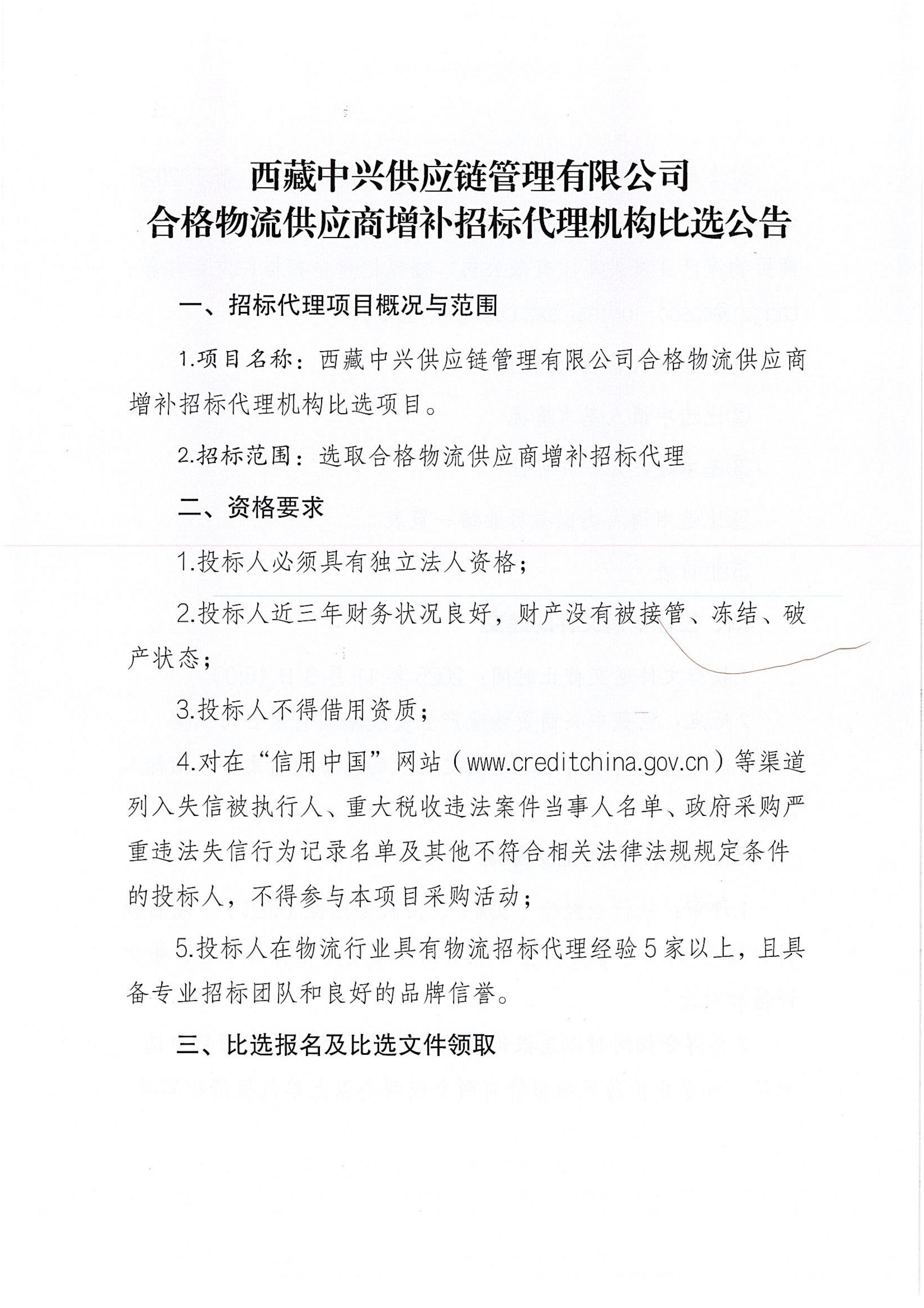 西藏中兴供应链管理有限公司合格物流供应商增补招标代理机构比选公告