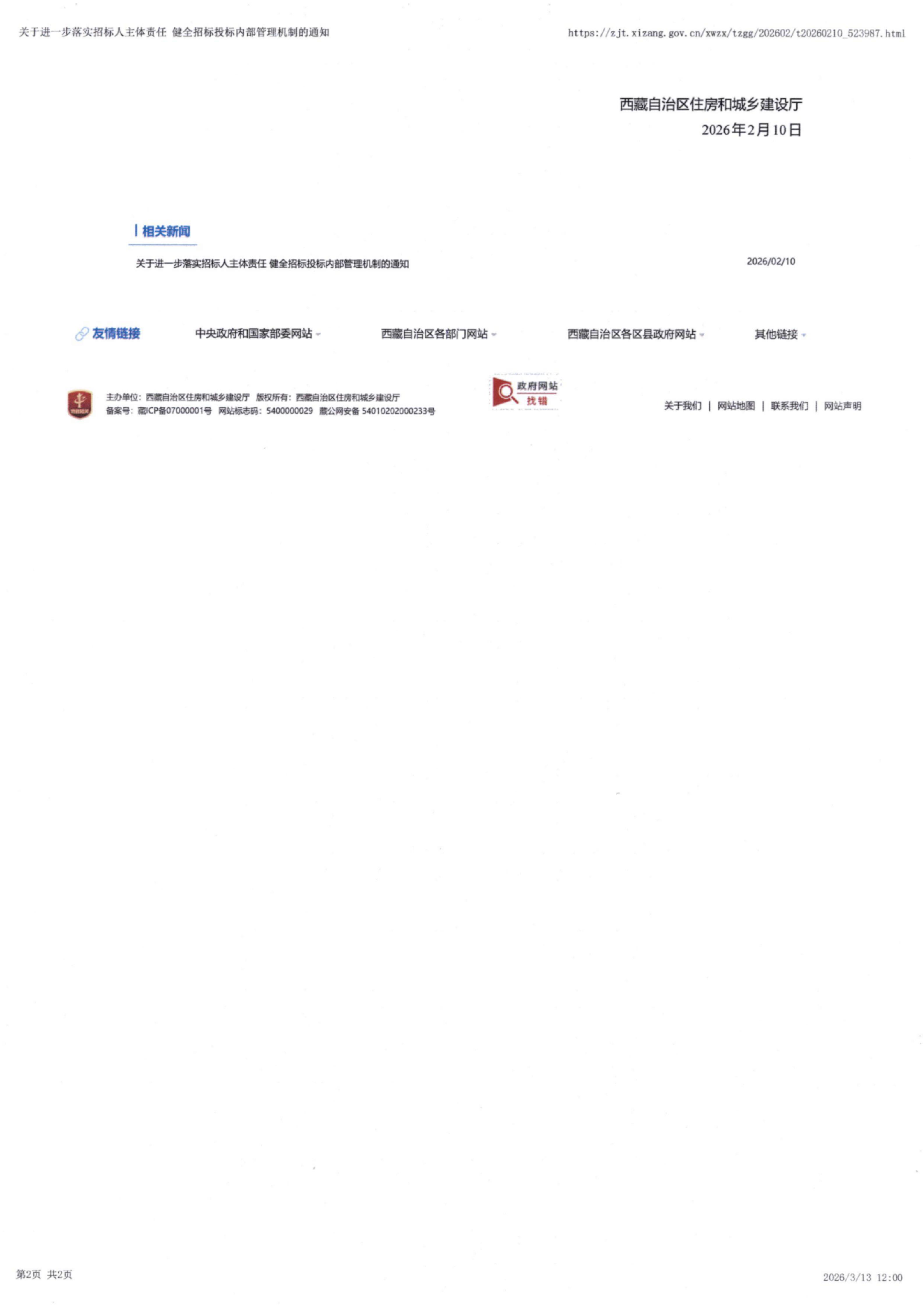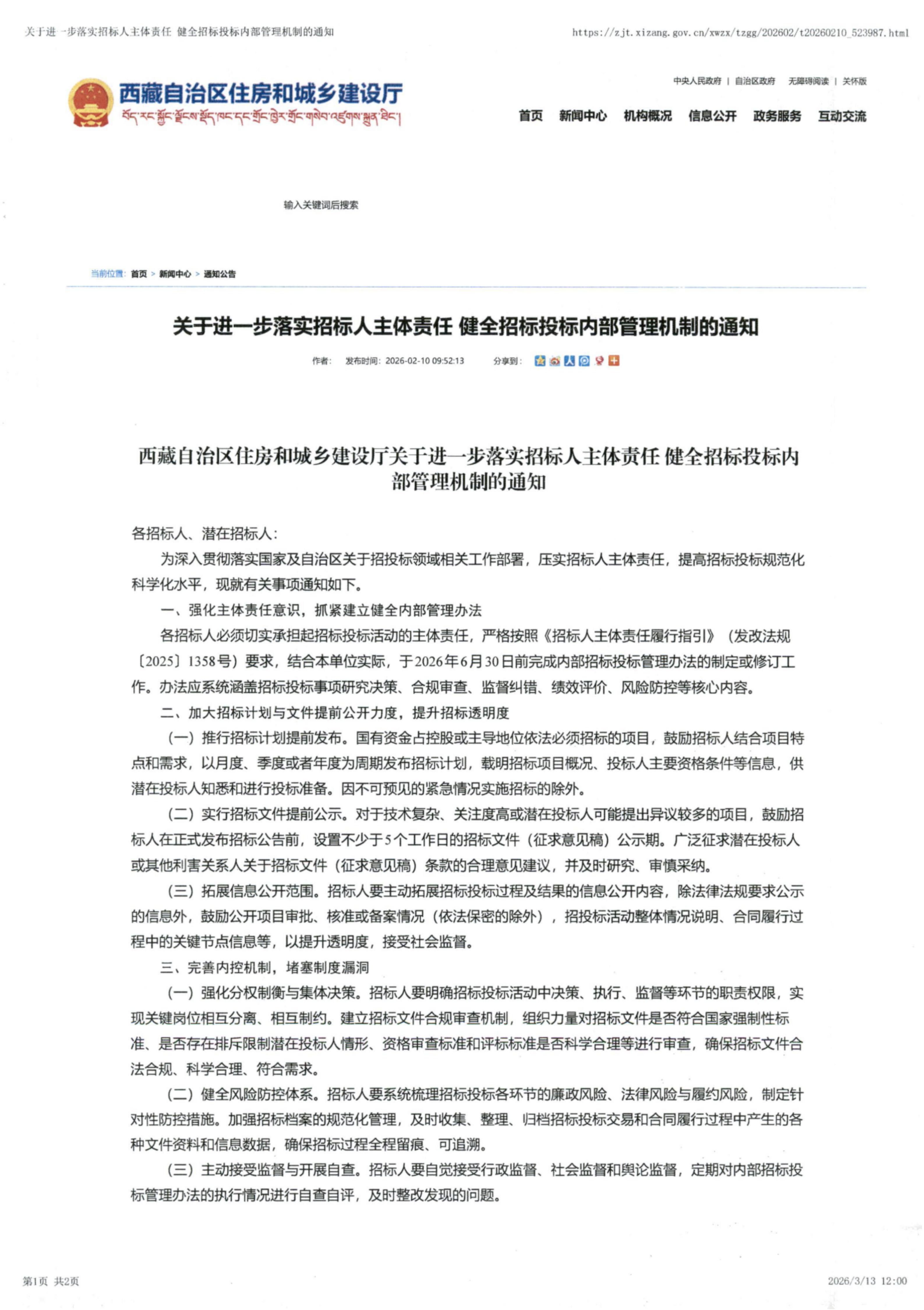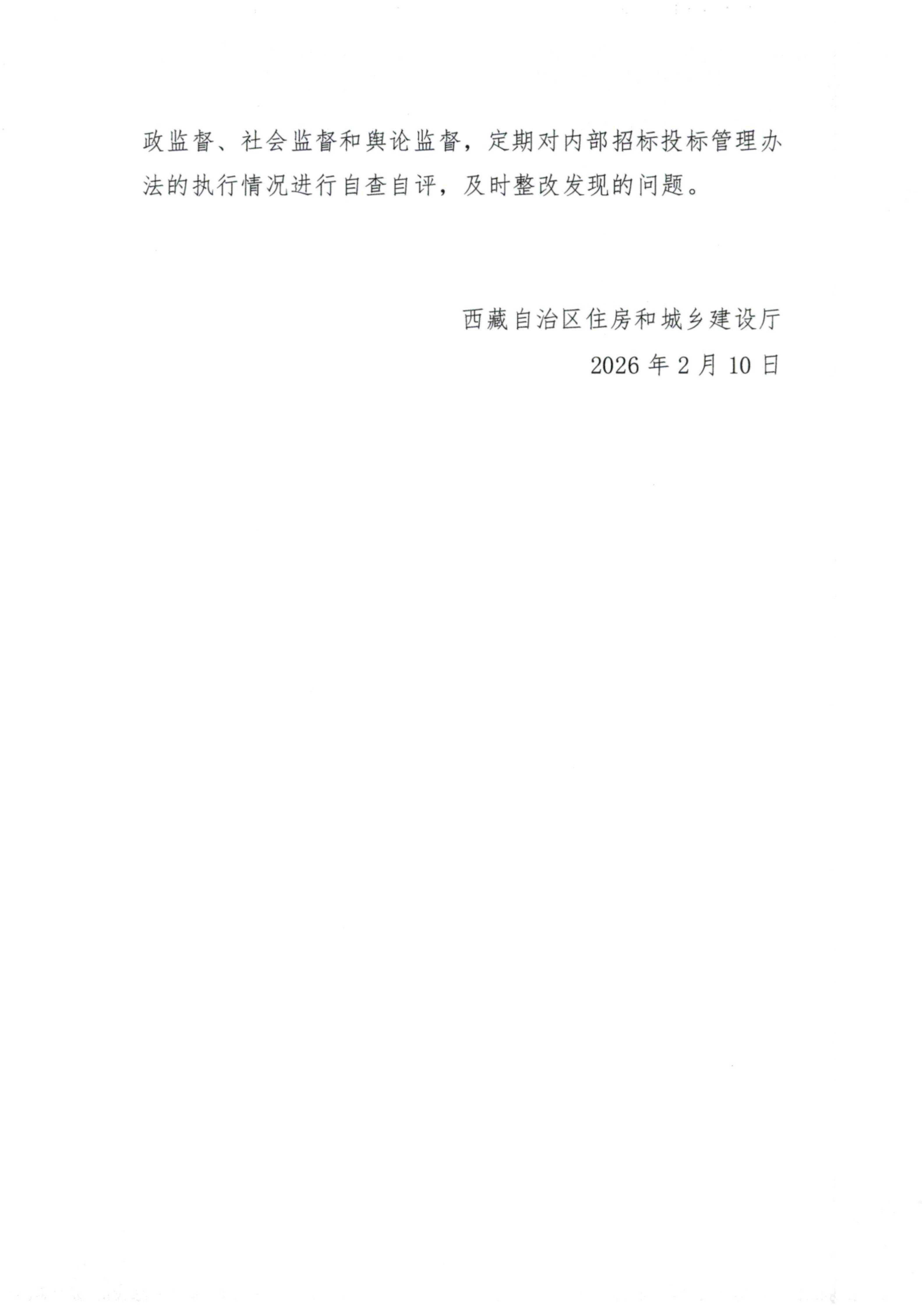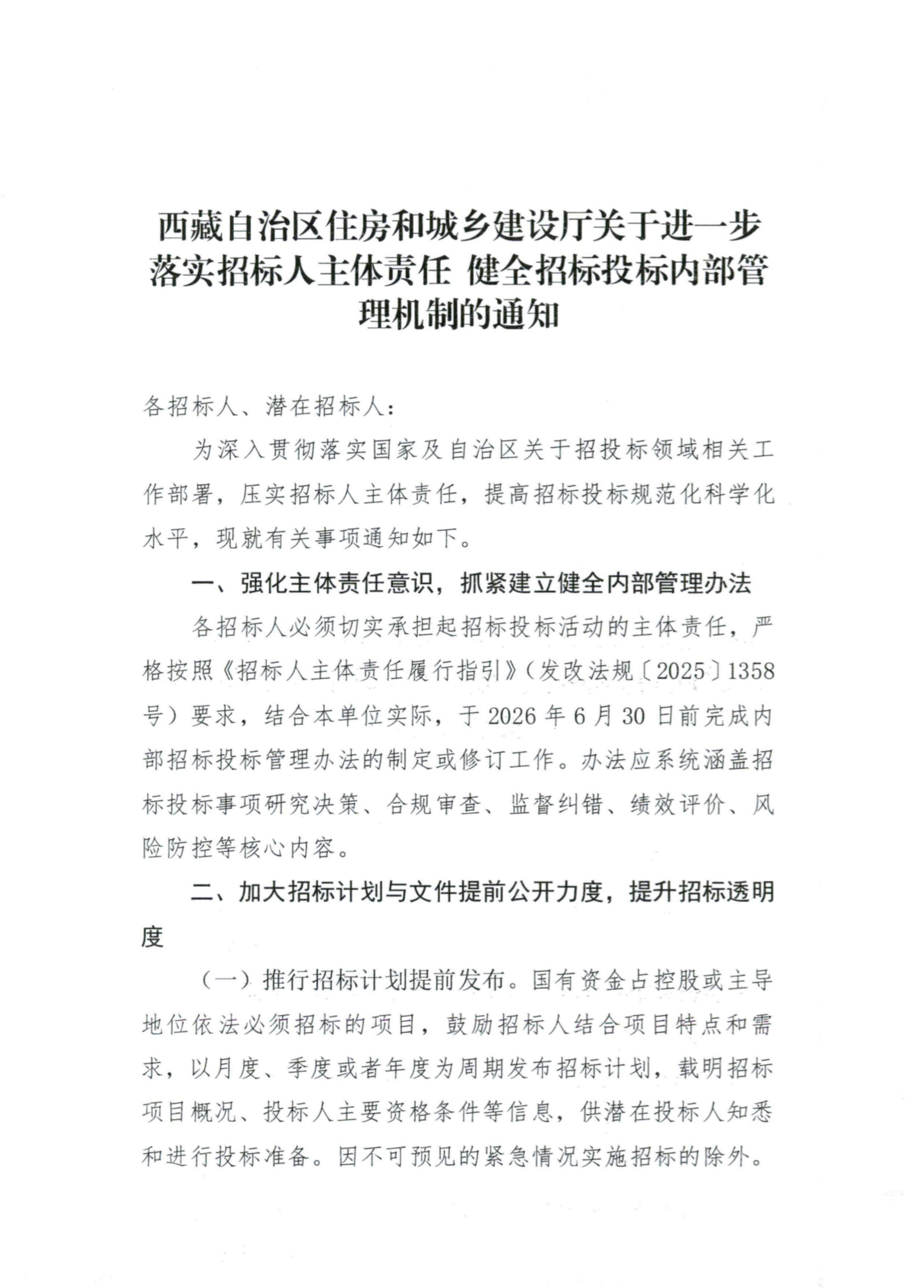 西藏自治区住房和城乡建设厅关于进一步落实招标人主体责任健全招标投标内部管理机制的通知