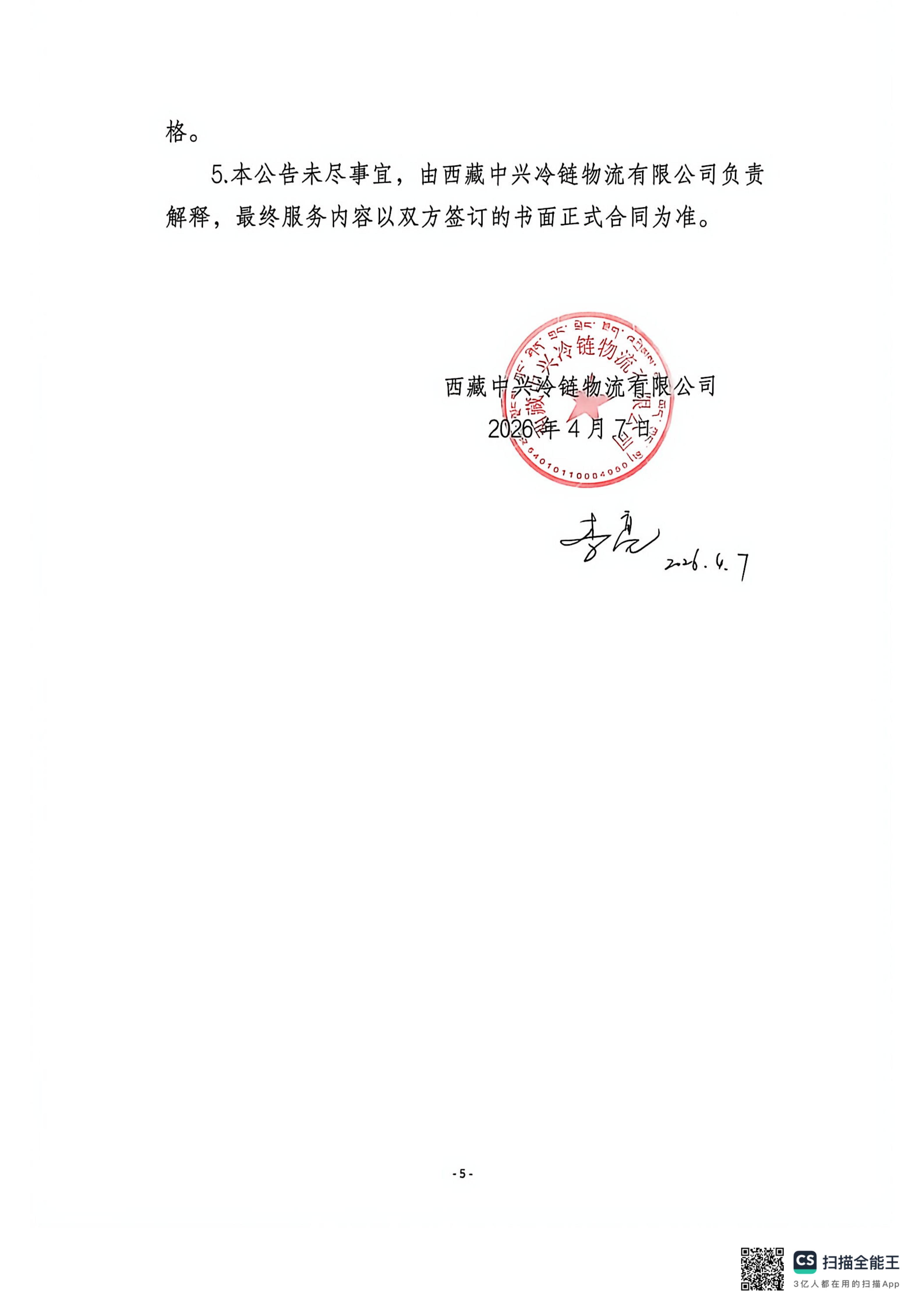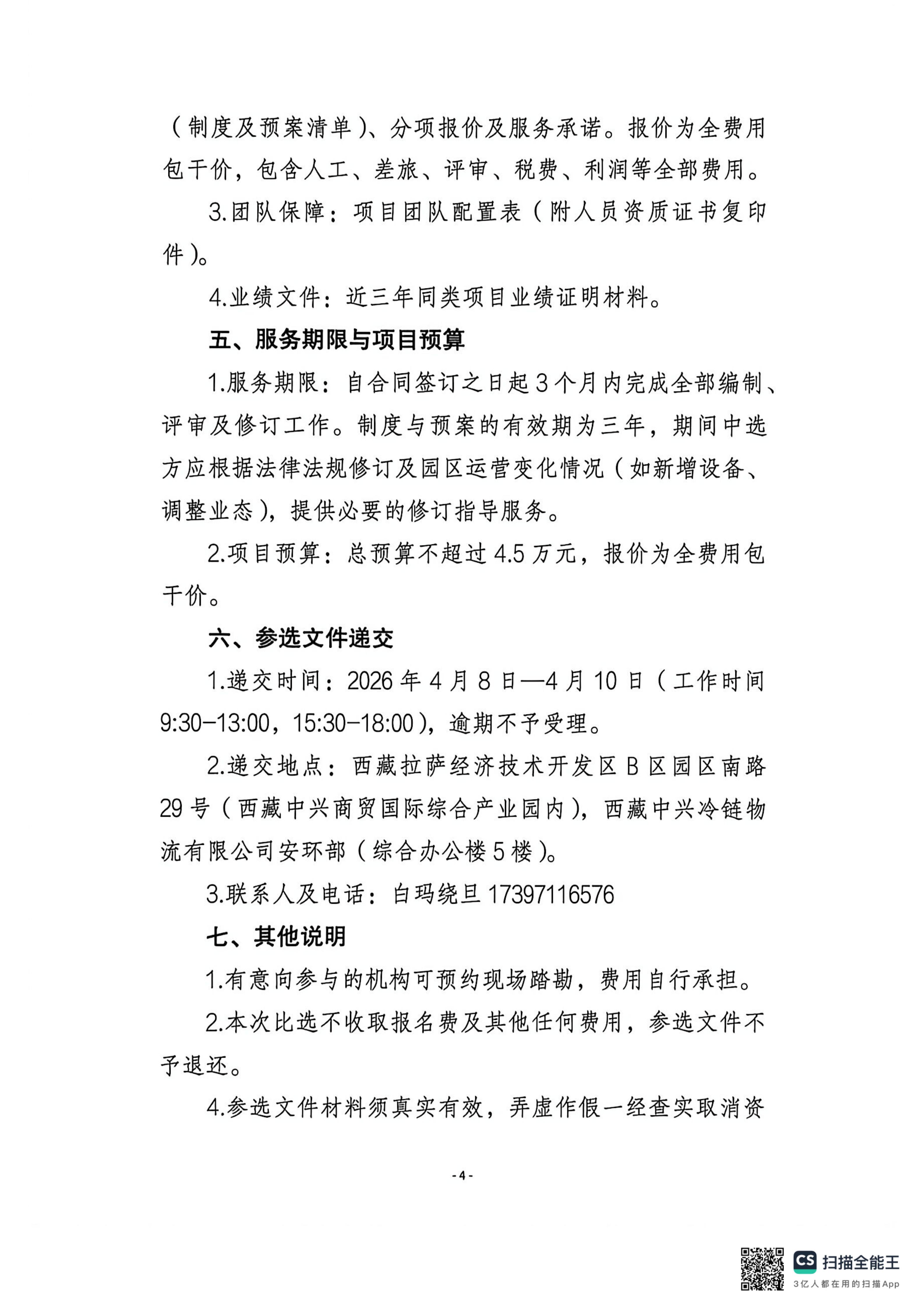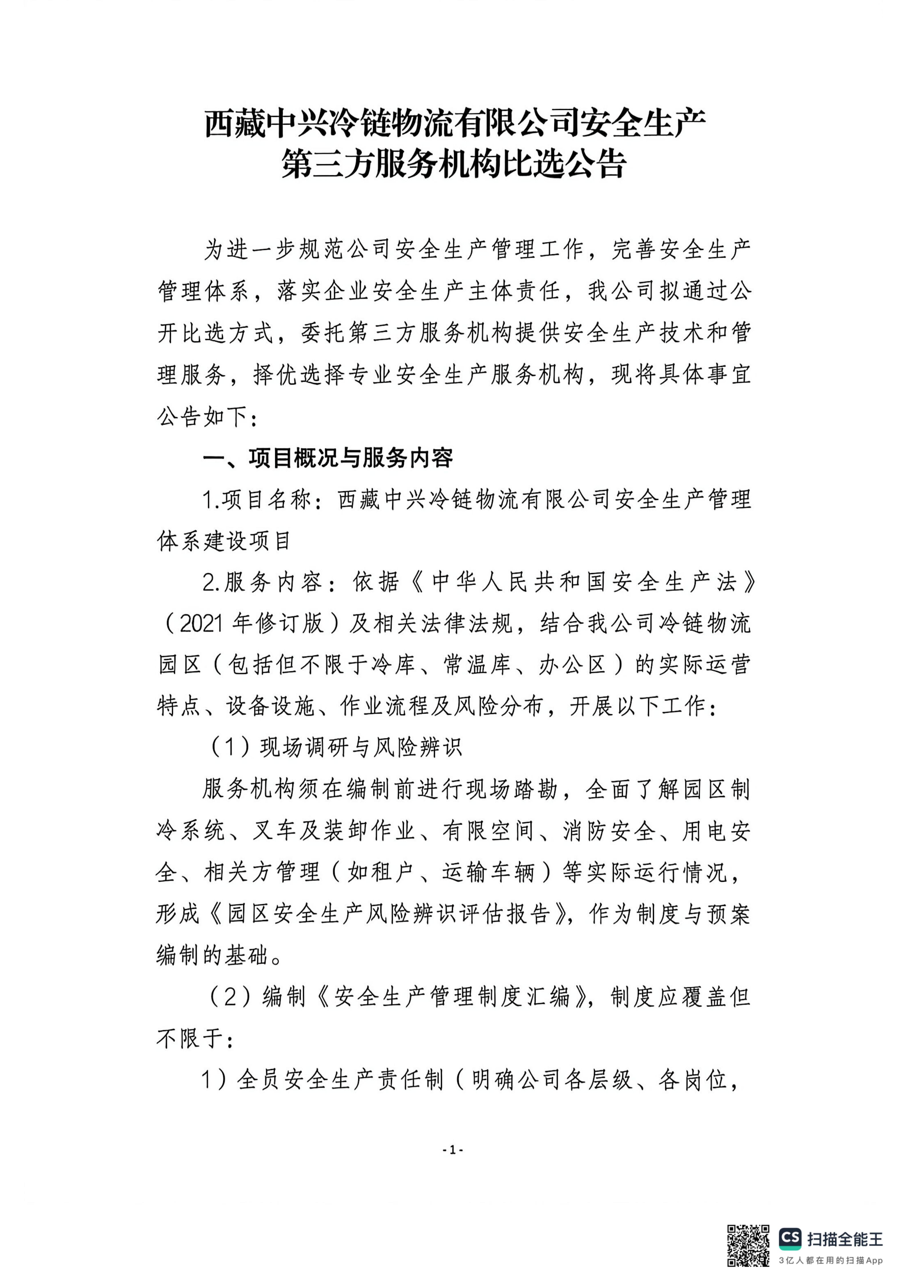 西藏中兴冷链物流有限公司安全生产第三方服务机构比选公告