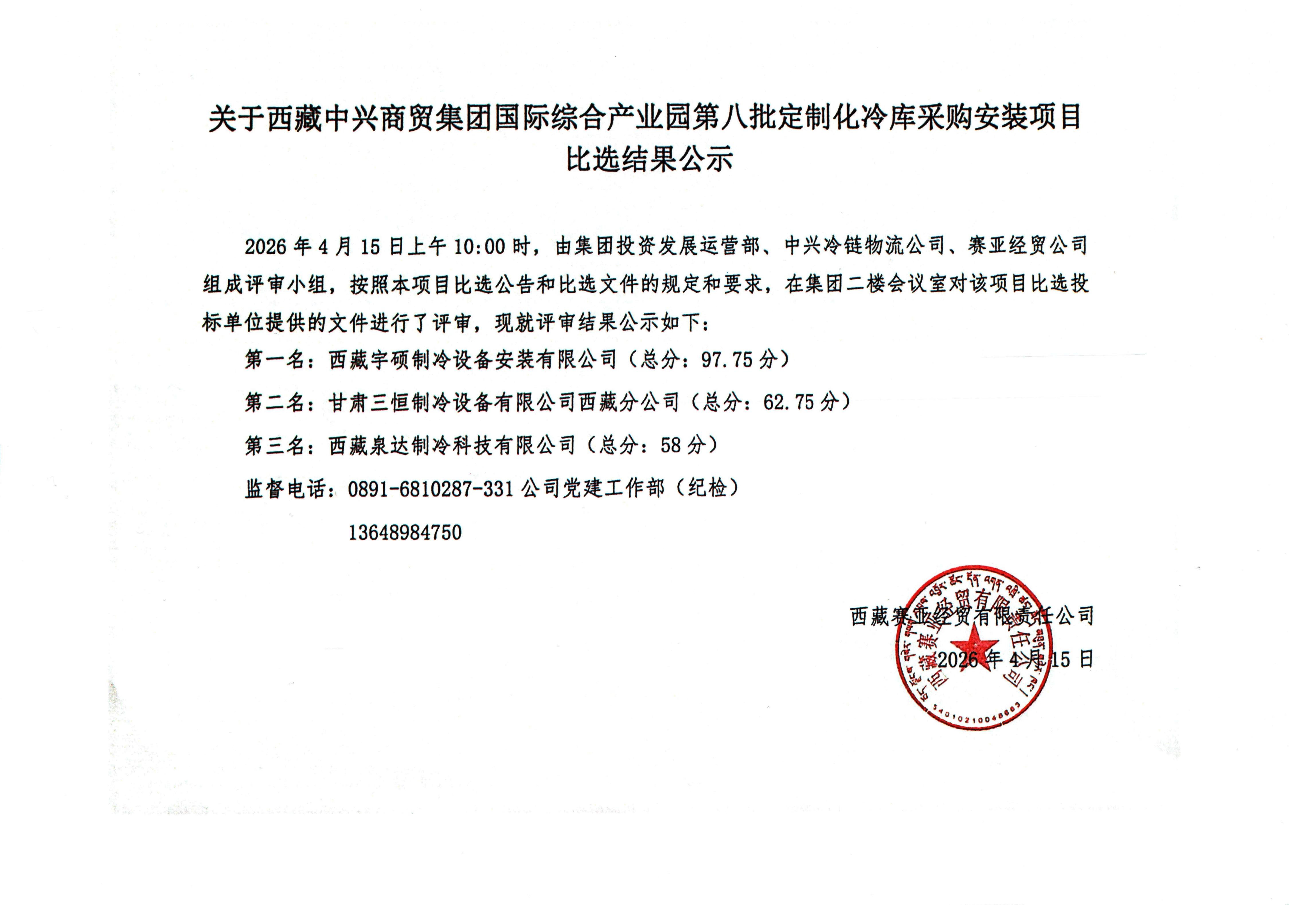 关于西藏中兴商贸集团国际综合产业园第八批定制化冷库采购安装项目比选结果公示