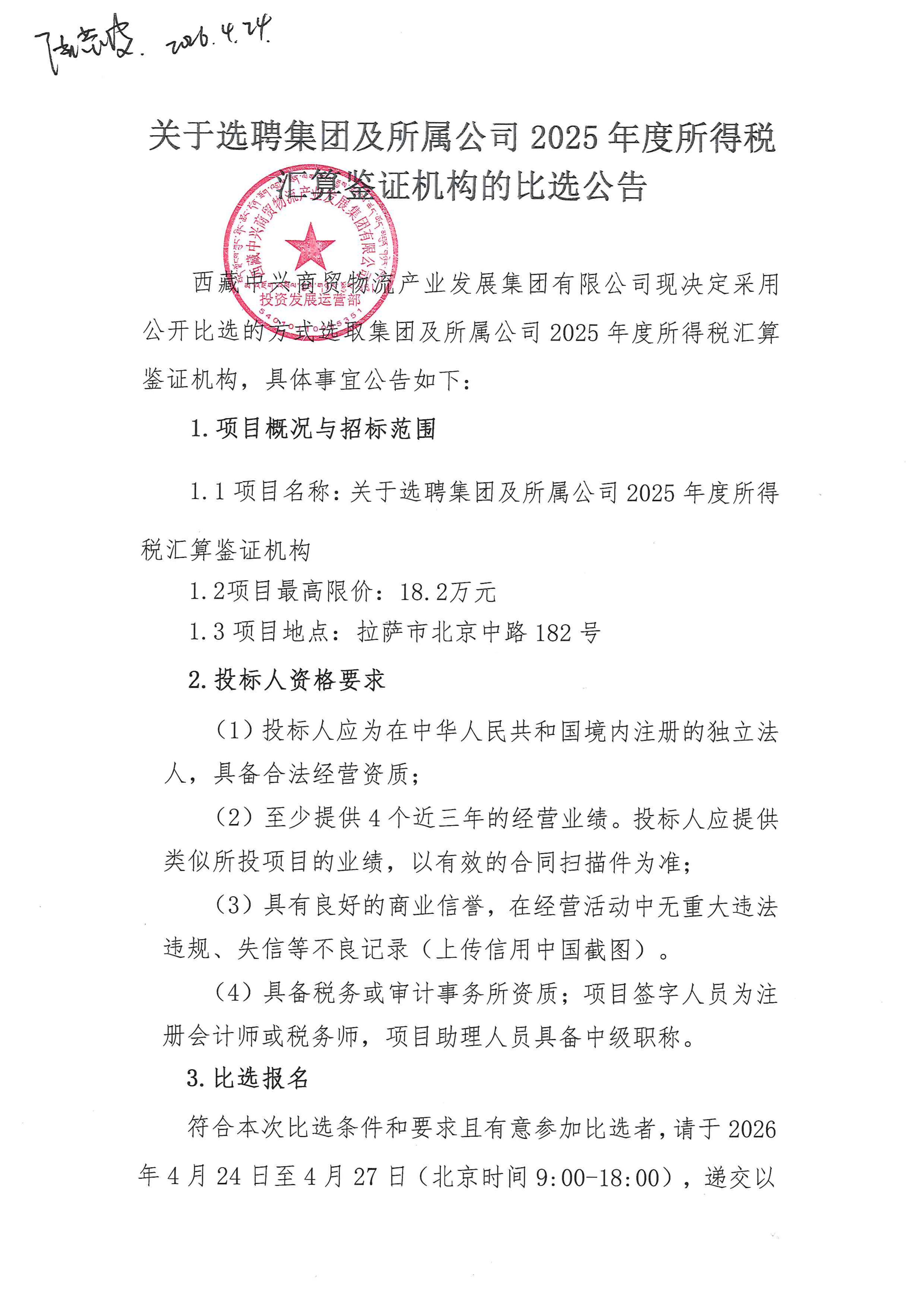 关于选聘集团及所属公司2025年度所得税汇算鉴证机构的比选公告