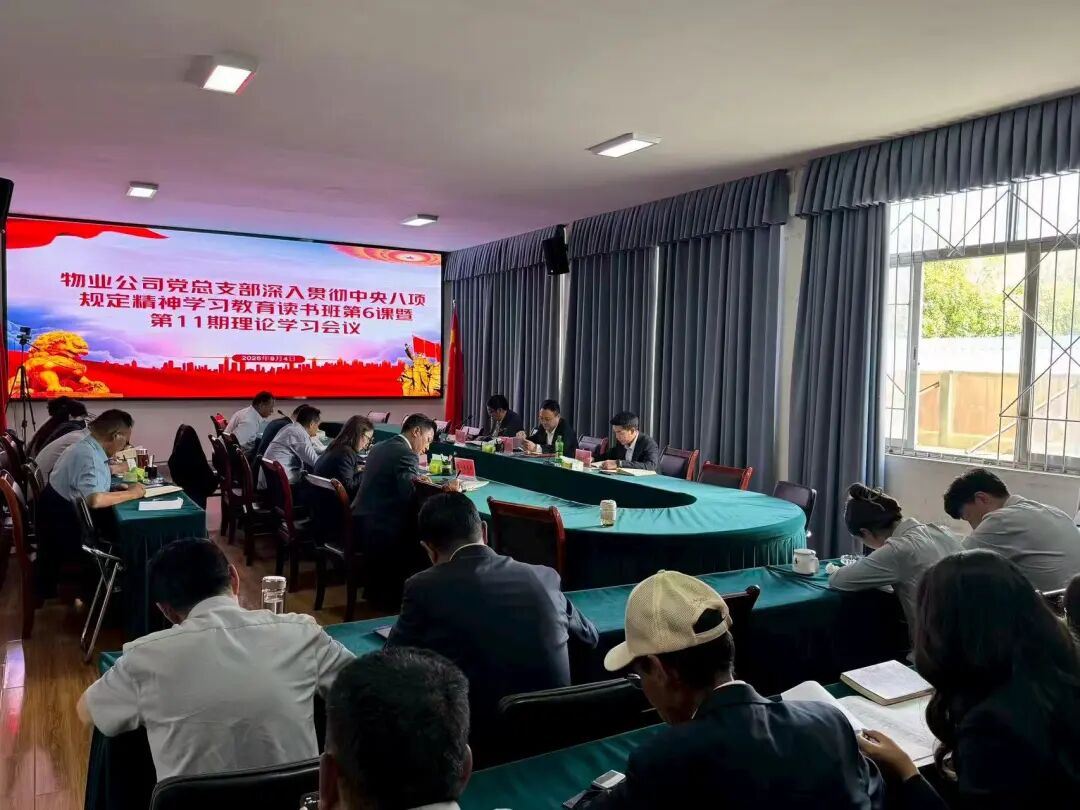 2025年9月4日,物业公司党总支部组织召开深入贯彻中央八项规定精神学习教育读书班第6课暨第11期理论学习会议,会议由党总支部委员罗布次仁同志主持。会议主要传达学习了《习近平关于加强党的作风建设重要论述摘篇》和“关于认真贯彻习近平总书记重要讲话精神进一步抓紧抓细深入贯彻中央八项规定精神学习教育的通知”等系列文件精神。