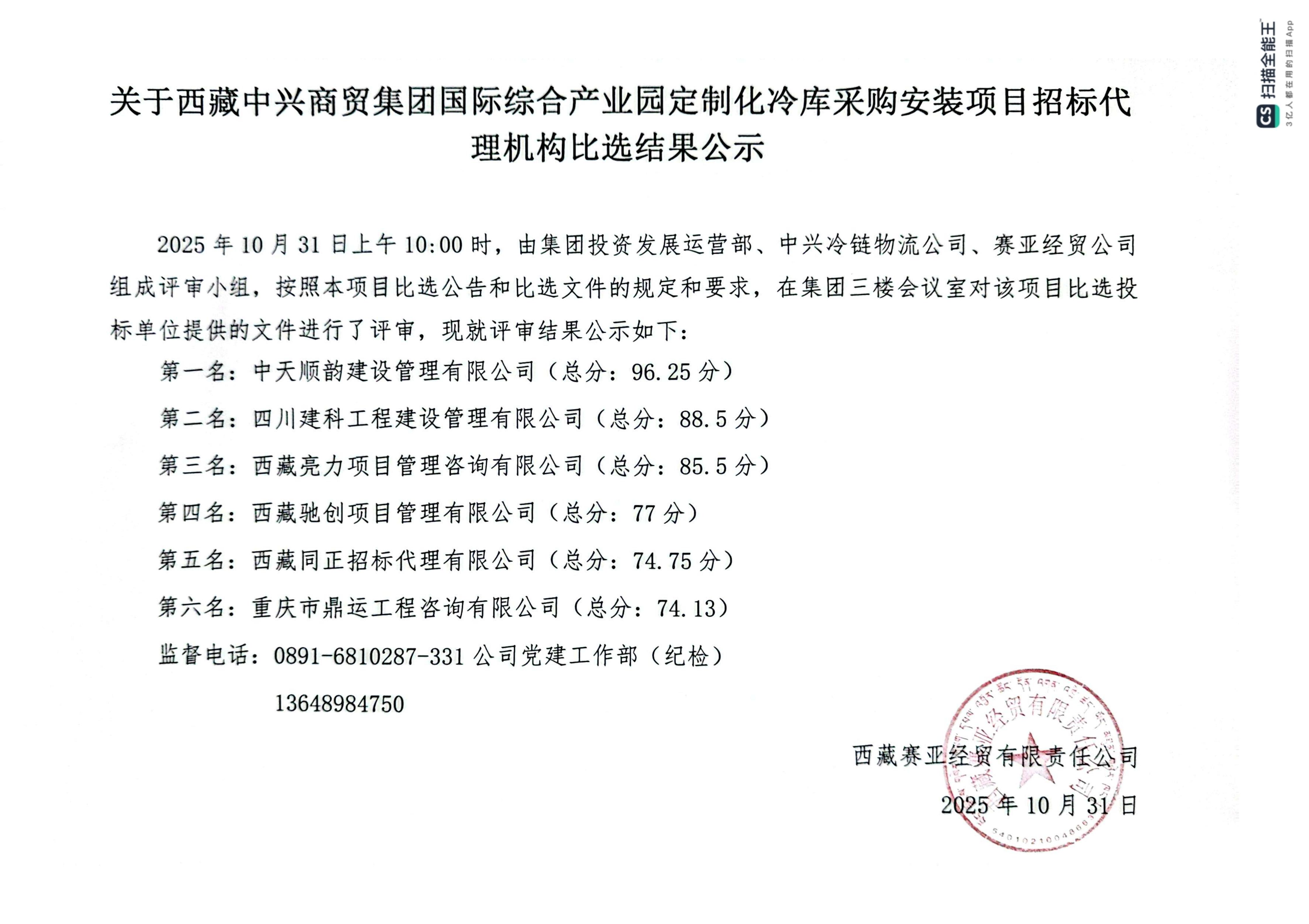 关于西藏中兴商贸集团国际综合产业园定制化冷库采购安装项目招标代理机构比选结果公示