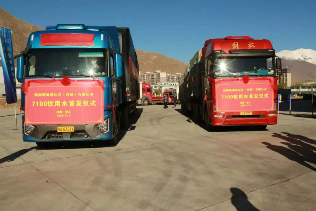 仪式现场,满载西藏“7100”饮用水首发车队鸣笛启程,标志着“藏品出藏”迈出实质步伐,西藏特色产品通过陆海新通道走向全国迈出关键一步。
