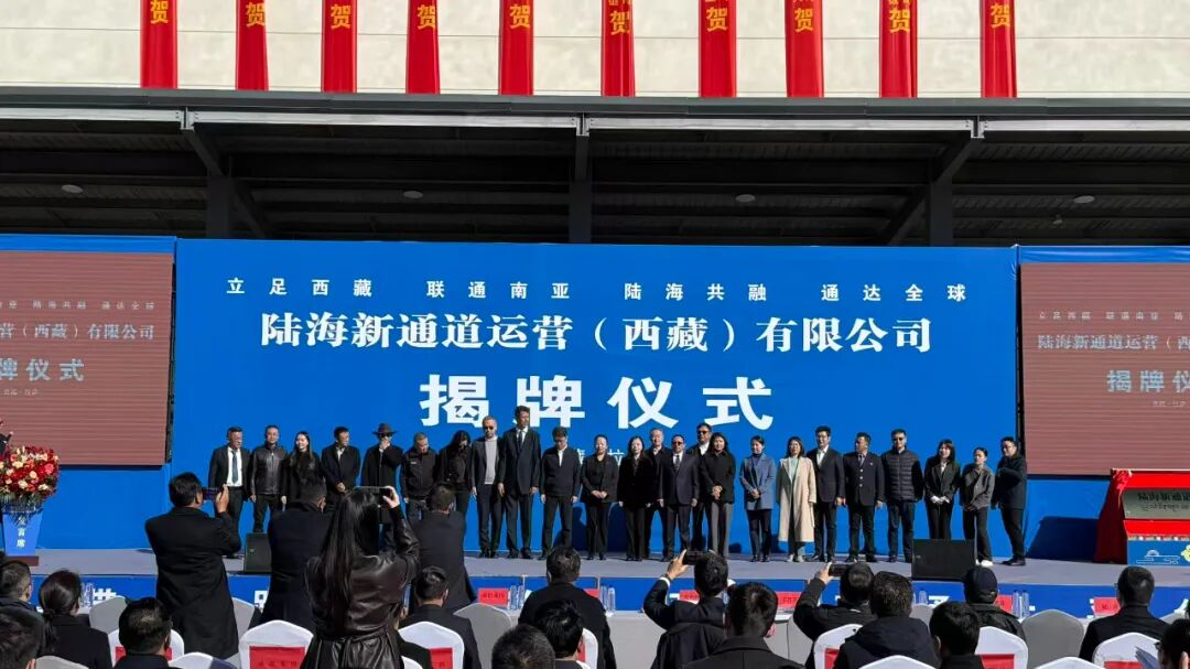 བོད་ལྗོངས་ཀྲུང་ཤིན་ཚོང་དོན་ཟོག་འགྲེམས་ཐོན་ལས་གོང་འཕེལ་ཚོགས་པ་ཚད་ཡོད་ཀུང་སི།2025年11月3日,陆海新通道运营(西藏)有限公司(以下简称“西藏区域公司”)揭牌仪式在拉萨经开区隆重举行。西藏自治区人民政府国有资产监督管理委员会党委委员、副主任拉巴卓玛,西藏自治区商务厅党组成员、副厅长尼玛顿珠,重庆市人民政府口岸和物流办公室党组成员、副主任李颜,陆海新通道运营有限公司党委副书记、总经理王开乐,西藏中兴商贸物流产业发展集团有限公司党委副书记、总经理丹洋,以及经开区管委会、综保区管理局、青藏铁路公司、区政府国资委属产业集团、各大金融机构、客户代表等百余人出席,共同见证西藏区域公司揭牌。