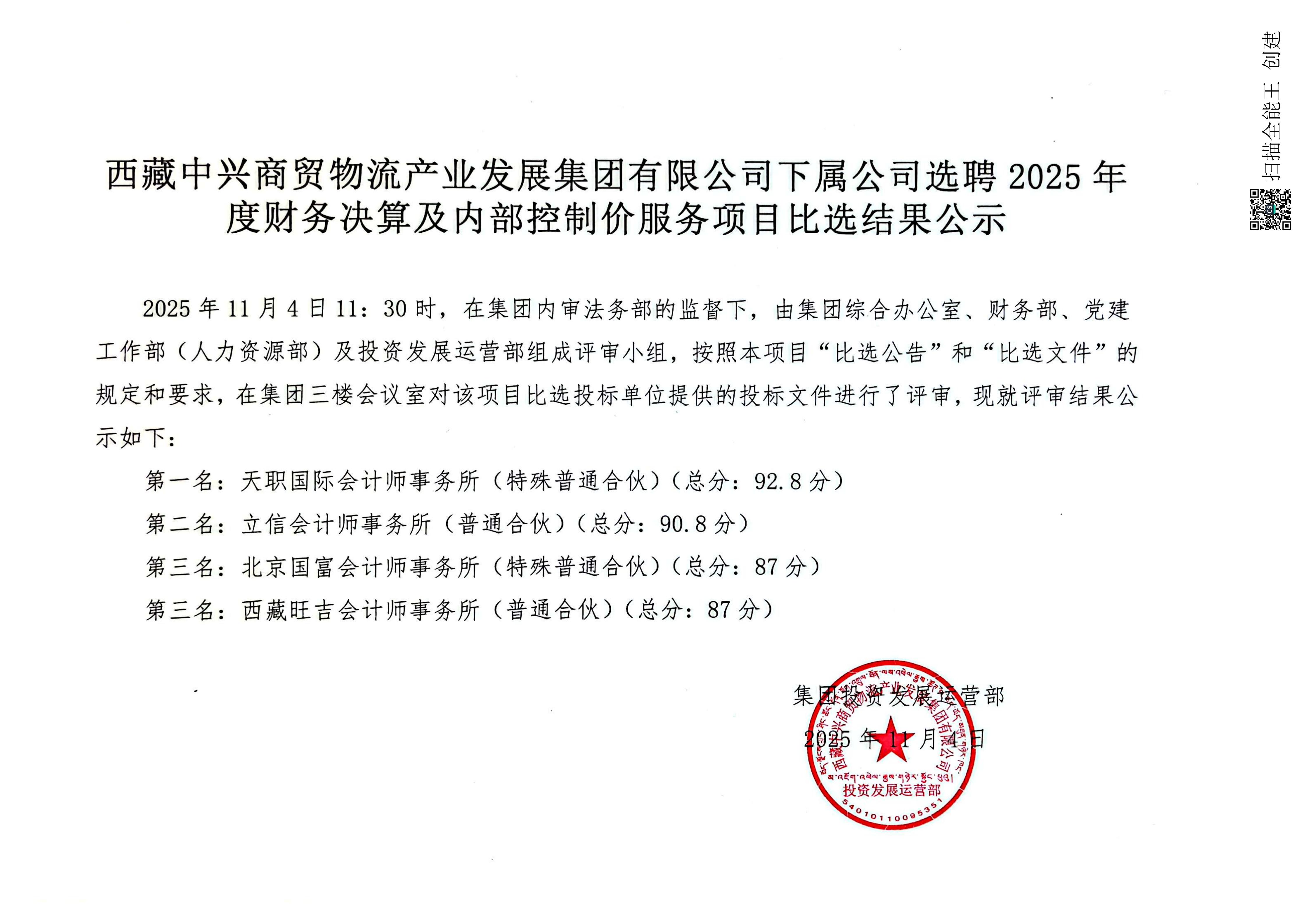 西藏中兴商贸物流产业发展集团有限公司下属公司选聘2025年度财务决算及内部控制价服务项目比选结果公示