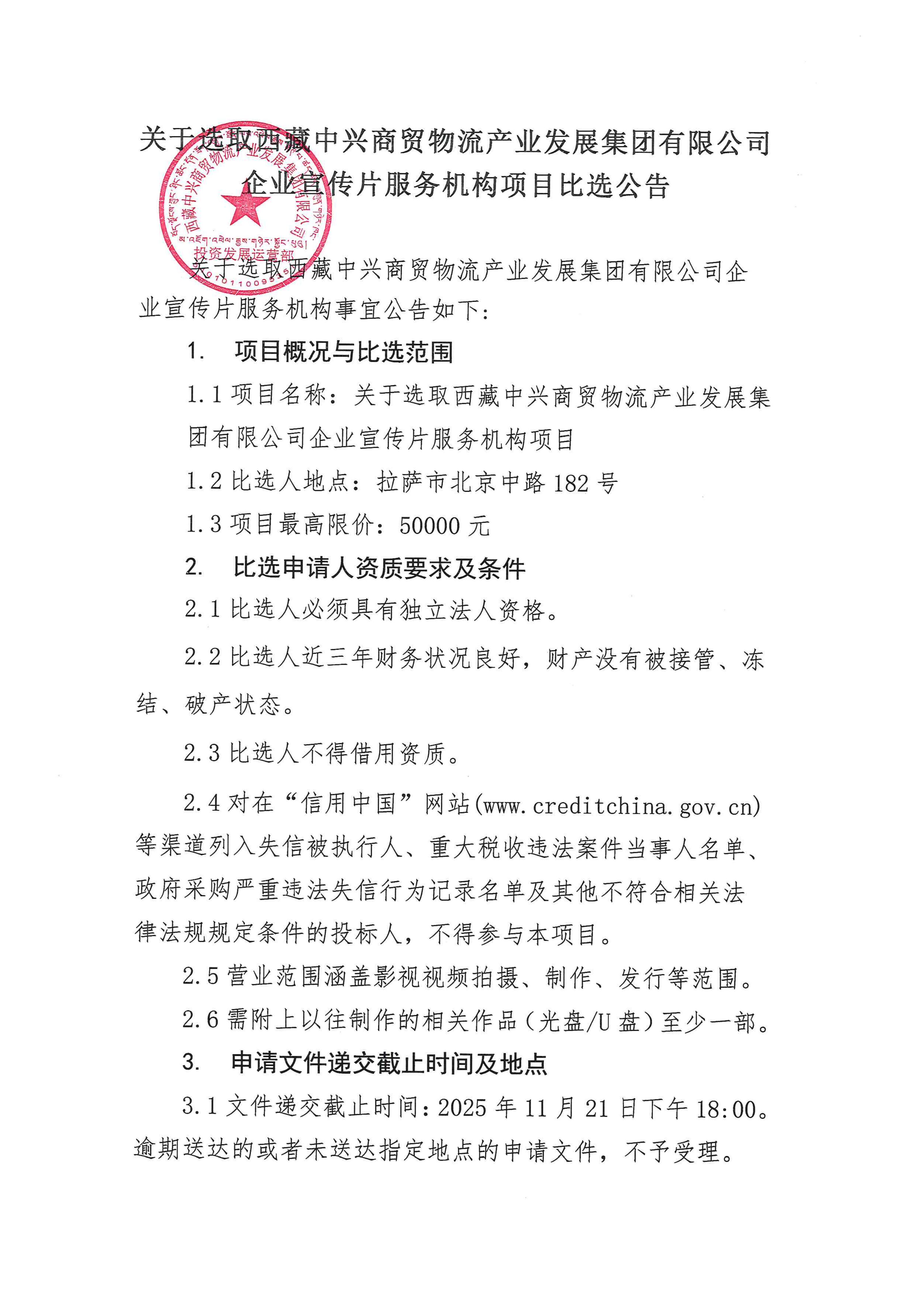 关于选取西藏中兴商贸物流产业发展集团有限公司企业宣传片服务机构项目比选公告
