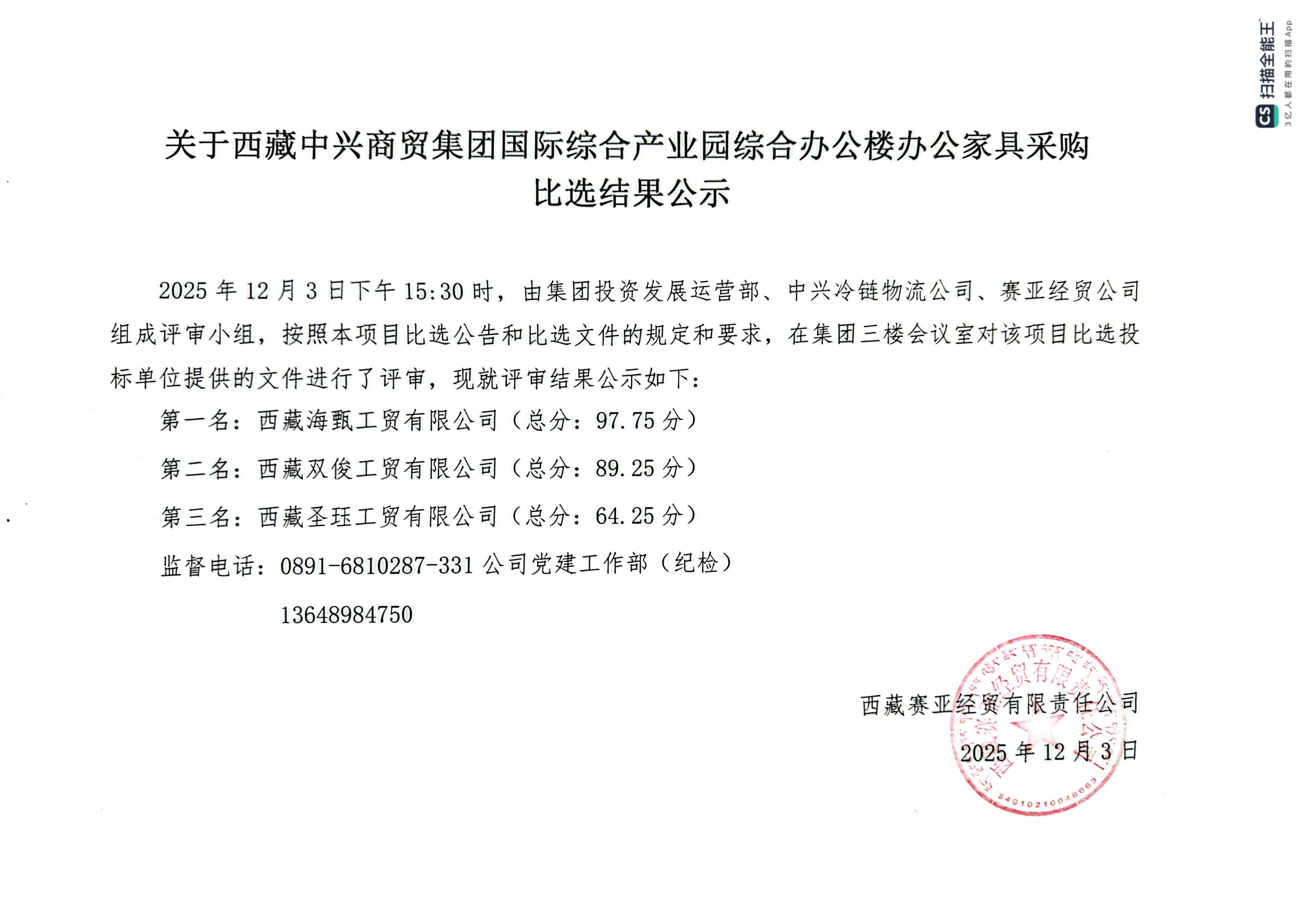 关于西藏中兴商贸集团国际综合产业园综合办公楼办公家具采购比选结果公示
