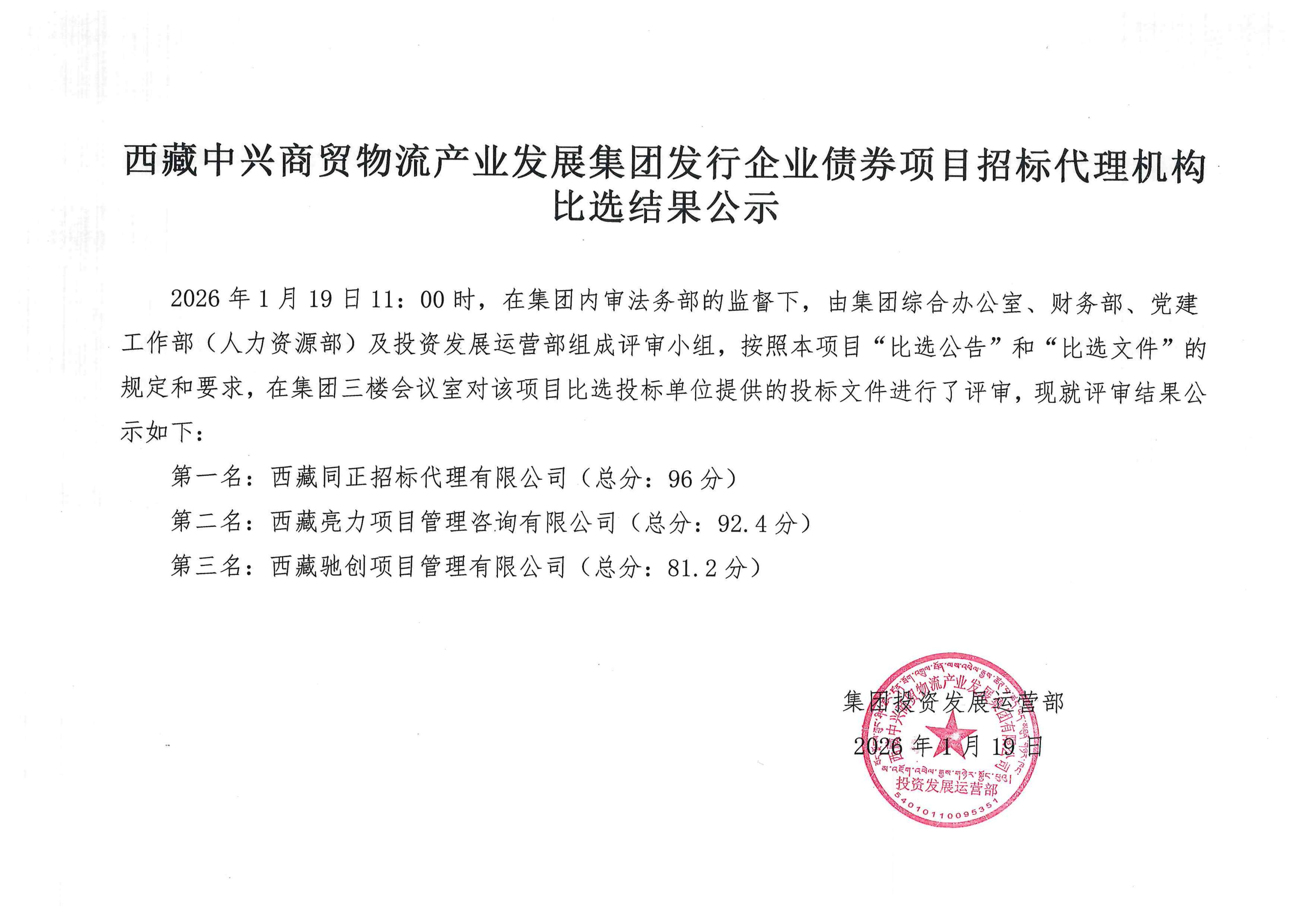 西藏中兴商贸物流产业发展集团发行企业债券项目招标代理机构比选结果公示